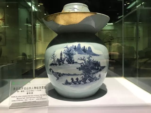 没错,川菜博物馆的镇馆之宝正是这样一个精美绝伦的泡菜坛,名作“青花四开光山水人物泡菜坛”,坛的整体以天蓝釉打底,开光画青花山水以及人物,坛底用六个正楷大字“大清康熙年制”表明了年份。胎质洁白,器形规整,青花自然且沉稳,山水人物布局清晰,画面的呈现角度顺畅画风清新,深得当时康熙皇帝的喜爱也因此流行一时。