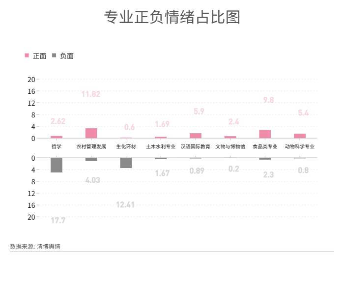 在清博舆情系统中,我们针对这几个专业的评价情况进行了统计和分析,可以看出,好评最高的是农村管理发展专业,其正面情绪高达11.82%。其次是食品类专业、汉语国际教育。生化环材的好评最低且负面评价次高,负面评价最高的是哲学专业。