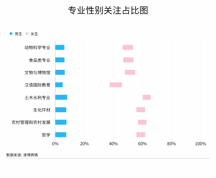 通过其清博舆情系统,我们把最好考专业的男女关注度进行了对比,发现大部分的专业,女性和男性的关注度近乎持平之间波动。但是汉语国际教育的女性关注度明显更高,占比62.57%。此外,土木水利专业的男生关注度超过60%。